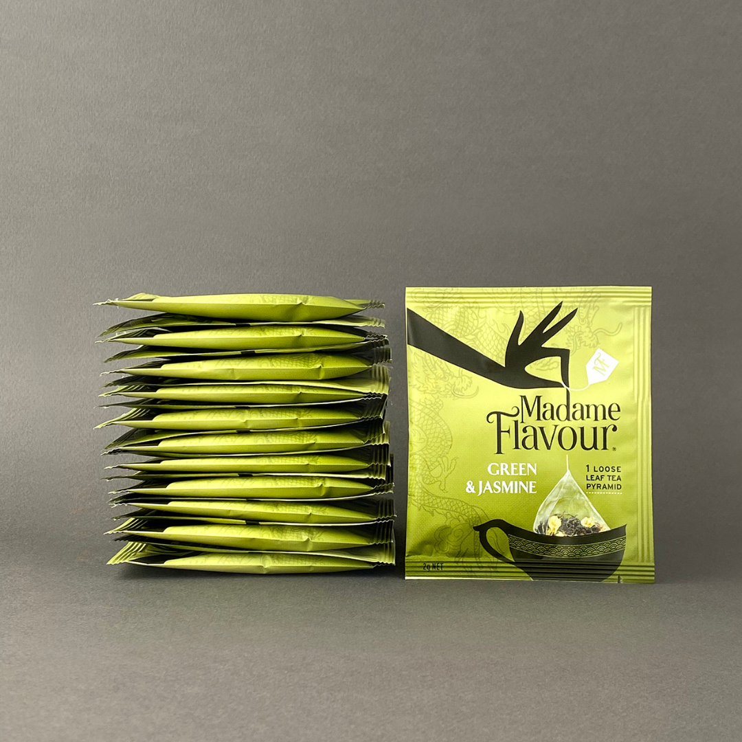 A blend of smooth Chinese green leaf tea, and jasmine flowers. Finished off with satisfyingly cool natural pear twist.
