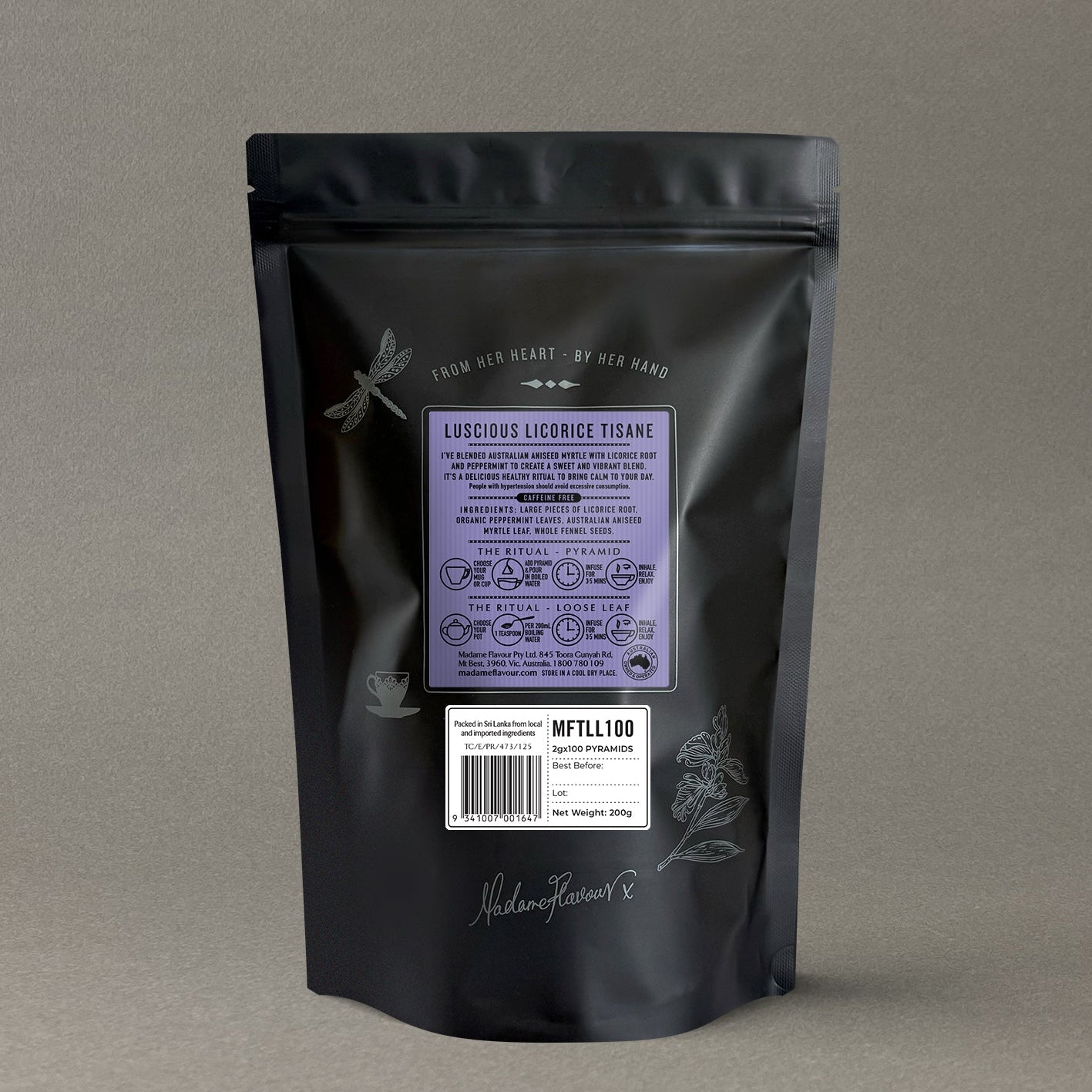 Inside the Luscious Licorice blend you can easily spot the large chunks of licorice root, which is sourced from friends along the lush green hills of Sri Lanka. This delicious blend is actually known to be a favourite of people who don’t usually enjoy eating licorice. The lesser-known cousin of lemon myrtle, aniseed myrtle is my favourite of all our native flavours. It is just so unexpected that a tree would have such delicate, perfumed leaves so naturally. When I first discovered this herb, I was determined to use it in a blend, and when I started exploring licorice root, realised that it was the perfect partner. The aniseed myrtle in your Luscious Licorice blend comes direct from Gary and Melissa in Lismore, who specialise in growing lemon and aniseed myrtle. A touch of organic peppermint adds a subtle thrill to this delicate, naturally sweet blend.